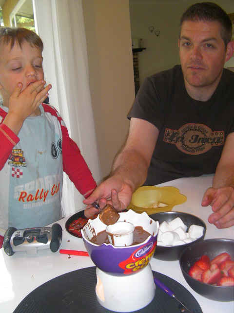 For Mothers day a few weeks ago David and Eli got me a Cadburys Creme Egg fondue. YUMMY! ELi has never had fondue before and he LOVED it. He is a true Oldfield with his chocolate obsession! He didn't really want any of the fruit or marshmallows so he just dipped them in and sucked the choc off! Here he is diving in! The funny thing was that he had already had a bath and had his PJ's on. He had to have another bath when he was all done!